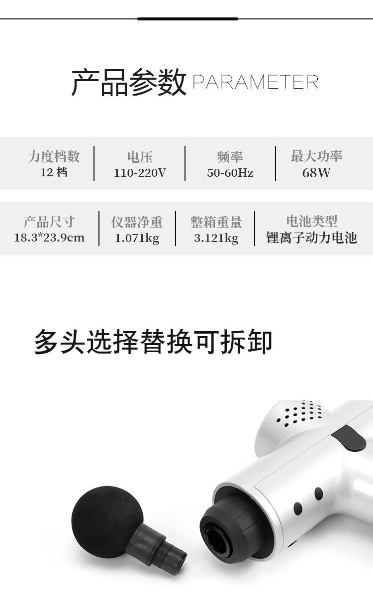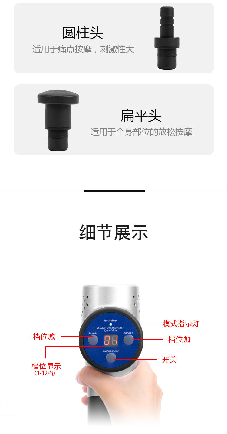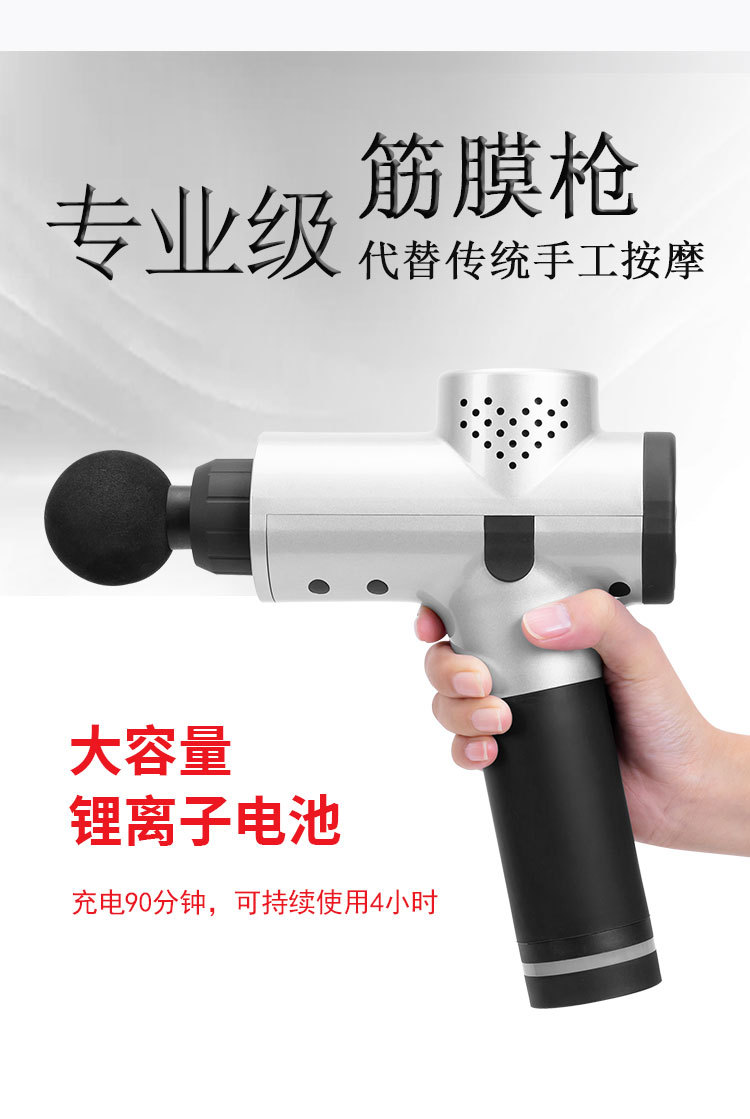 【產(chǎn)品名稱】肌肉筋膜按摩儀型號004【工作原理】筋膜槍能通過高頻振動穿透深層筋膜,來幫助肌肉軟組織放松,緩解脊椎周圍的肌肉僵硬,達到日常按摩的效果,而這樣的深層按摩效果是傳統(tǒng)手工按摩無法實現(xiàn)的。它還可以用來在人體運動前的熱身,增加肌肉韌性。運動后通過深度有力而精準(zhǔn)的肌肉按摩,可以深度緩解身體酸脹感、促進肌肉力量平衡,改善肌肉代謝功能。有助于更快地恢復(fù)身體,促進肌肉修復(fù),促進血液流動,緩解乳酸。它還可以用來在運動前的熱身過程中為身體做準(zhǔn)備。