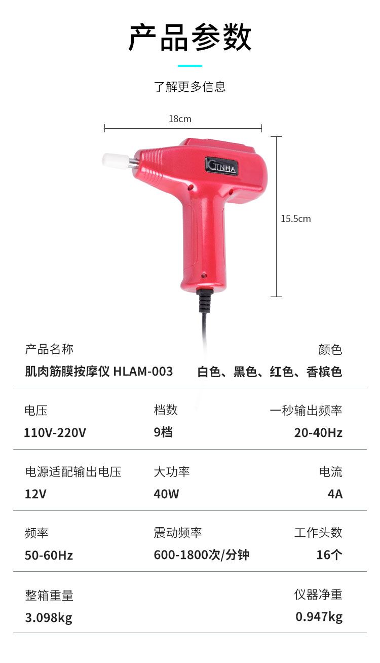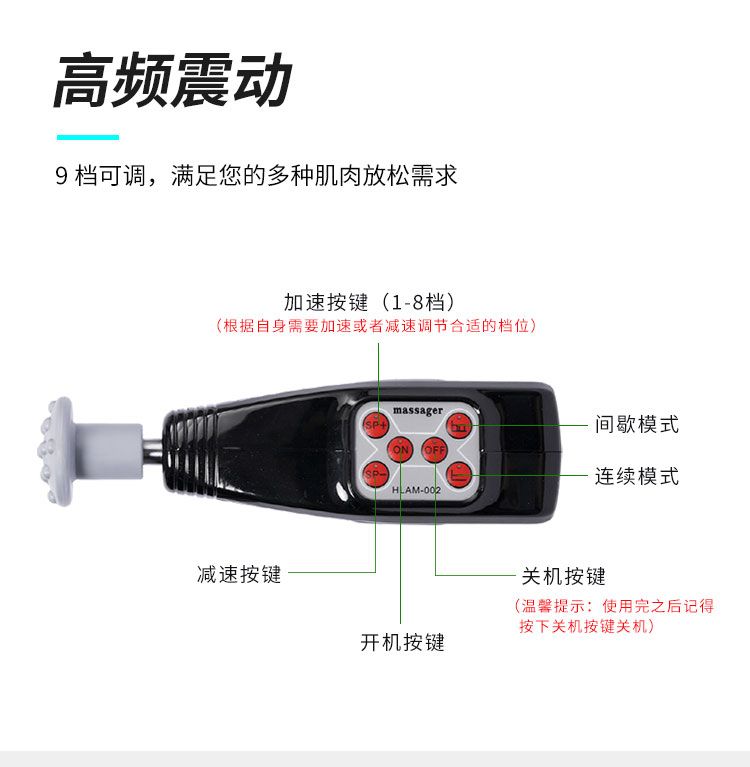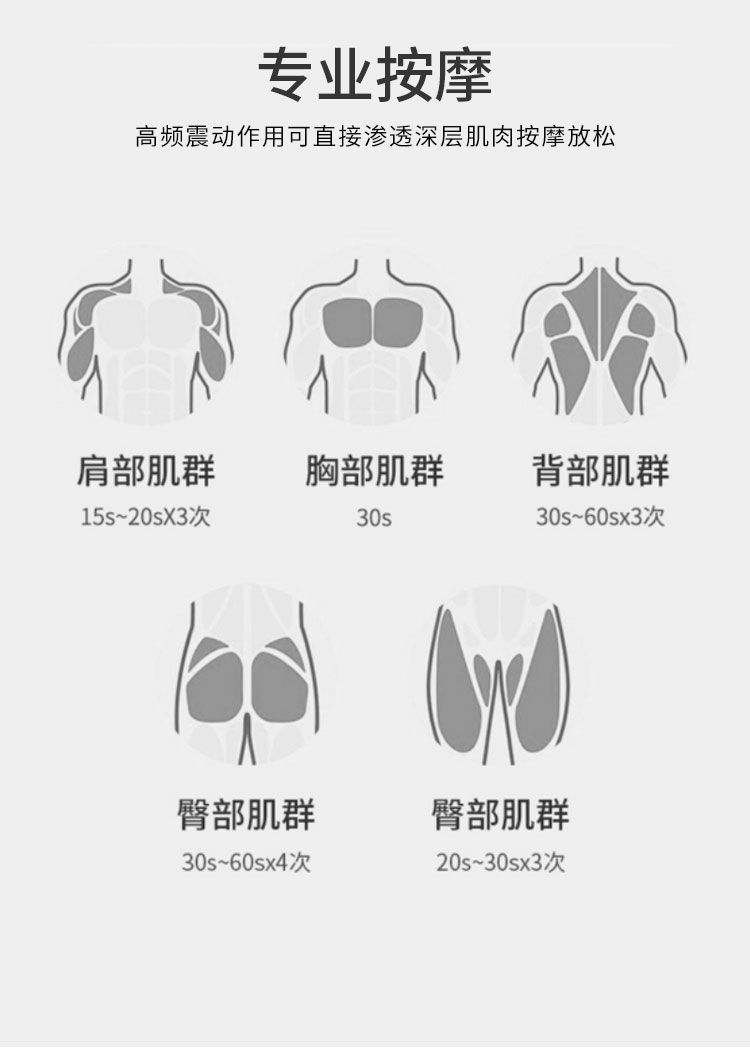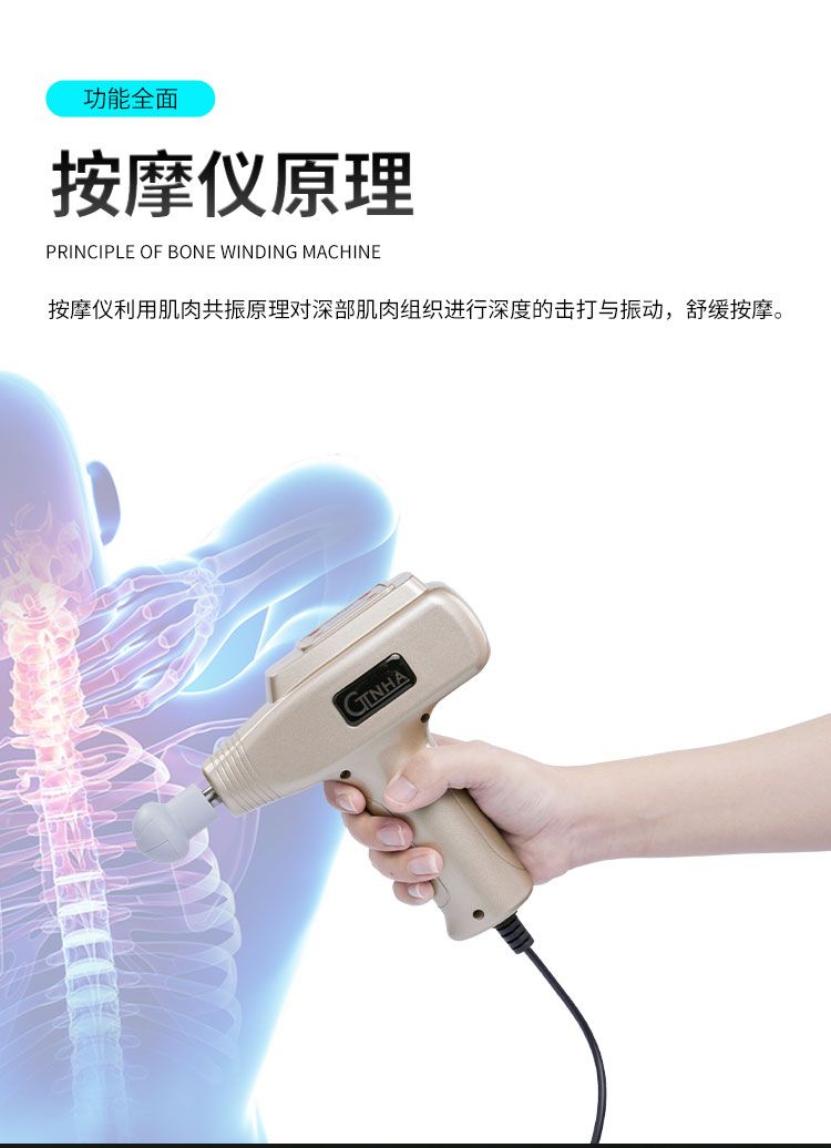【產(chǎn)品名稱】肌肉筋膜按摩儀型號(hào)003【工作原理】筋膜槍能通過(guò)高頻振動(dòng)穿透深層筋膜,來(lái)幫助肌肉軟組織放松,緩解脊椎周?chē)募∪饨┯?,達(dá)到日常按摩的效果,而這樣的深層按摩效果是傳統(tǒng)手工按摩無(wú)法實(shí)現(xiàn)的?!局饕攸c(diǎn)】①緩解肌肉緊張 ,可用于訓(xùn)練后全身或局部肌肉緊張痙攣的調(diào)理與放松,能緩解訓(xùn)練后乳酸堆積,預(yù)防損傷,提高運(yùn)動(dòng)表現(xiàn)。②保持肌肉與筋膜彈性:對(duì)肌肉與筋膜產(chǎn)生輕微的牽拉作用,可有效保持其彈性。③小巧便攜:方便攜帶和使用